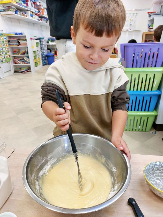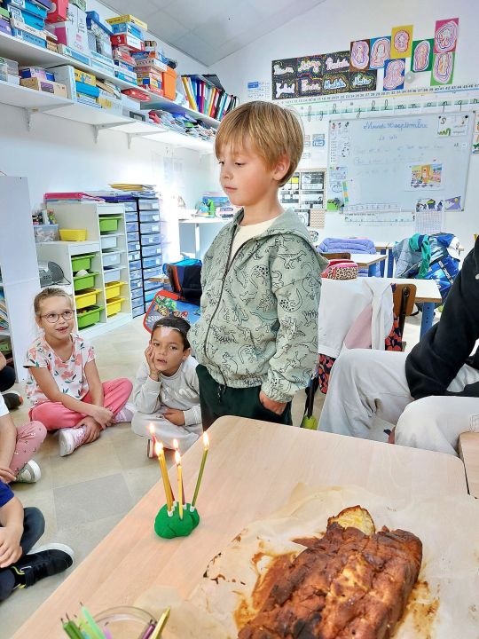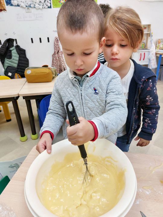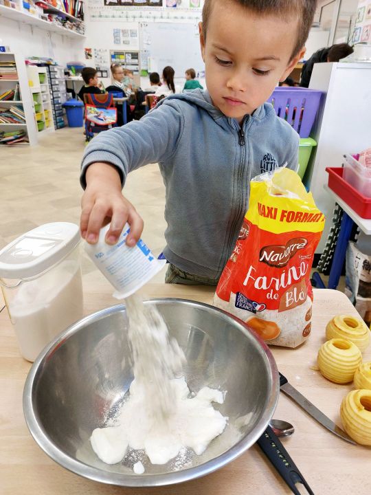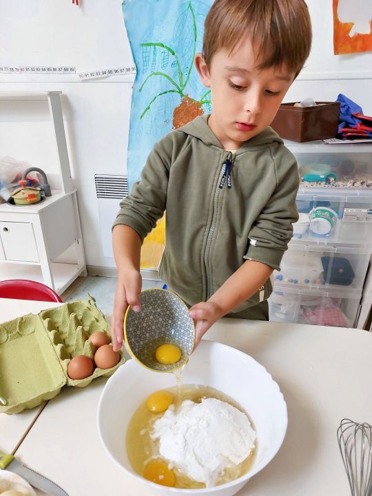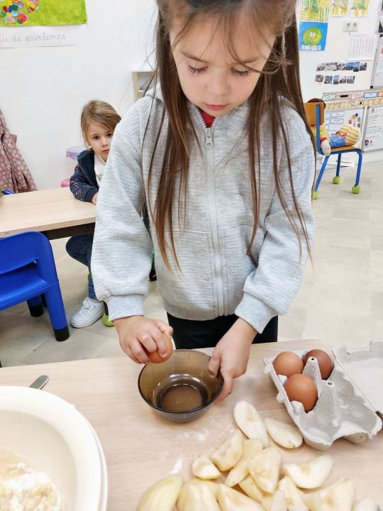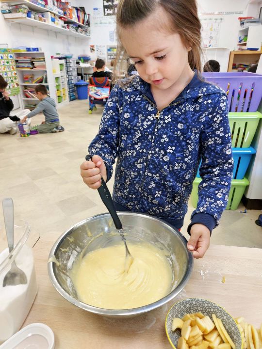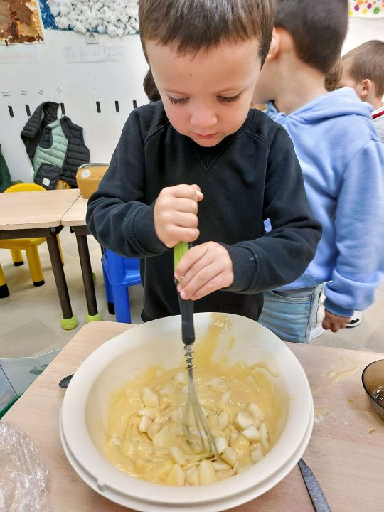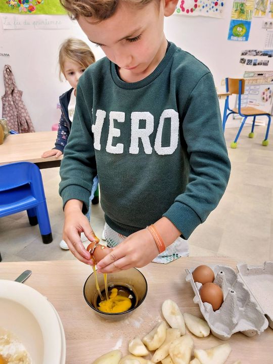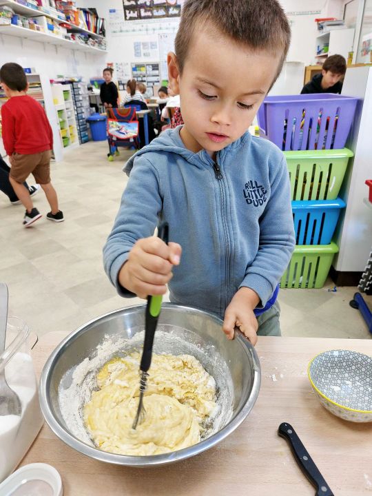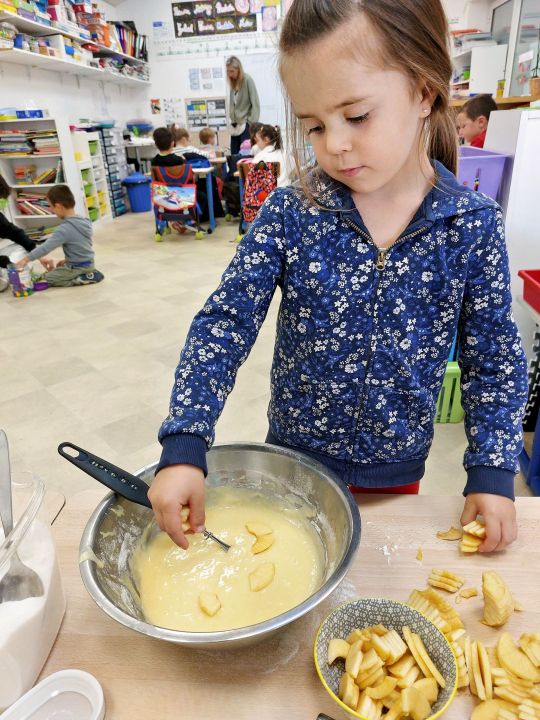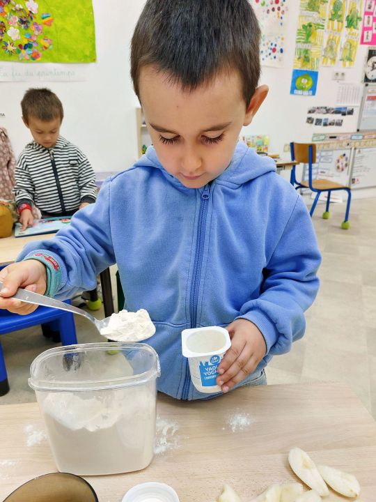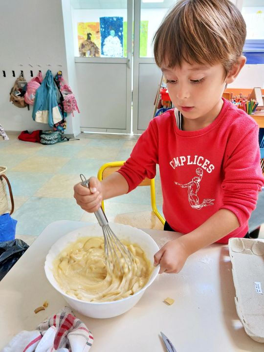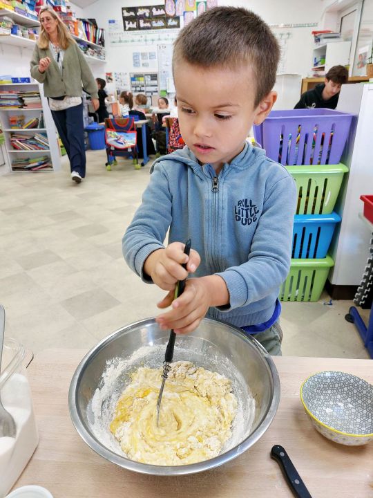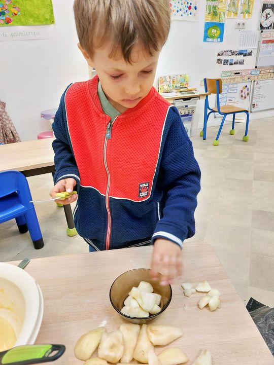 En cette dernière semaine de la première période, nous fêtons l'anniversaire de Maxime. Il fait 5 ans en ce mois d'octobre! Pour cela, nous avons cuisiné un gâteau aux poires avec Marion et nous l'avons partagé l'après-midi....
