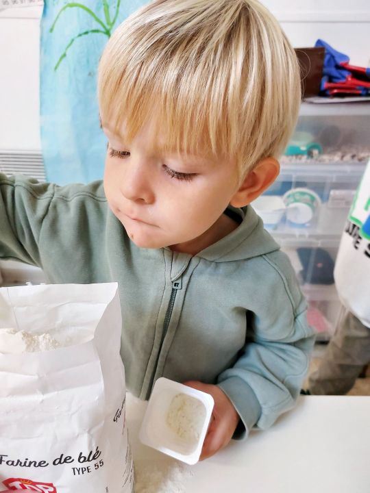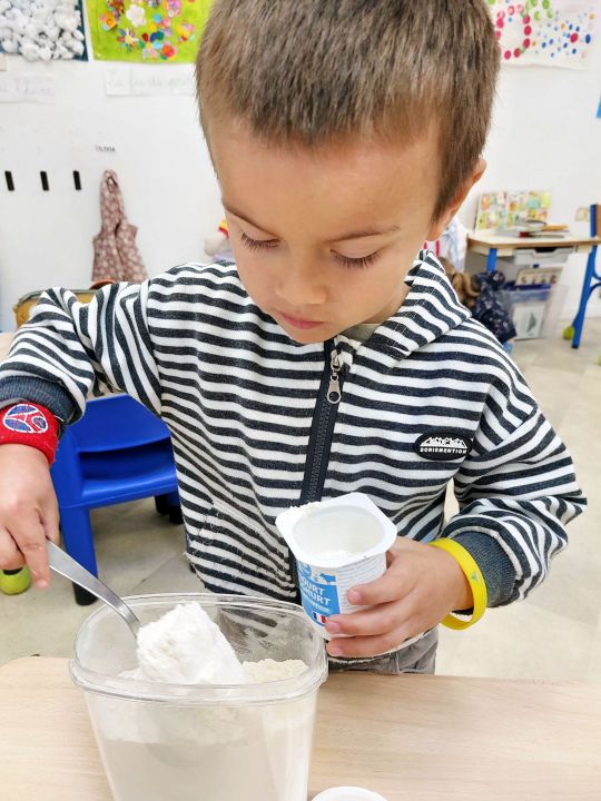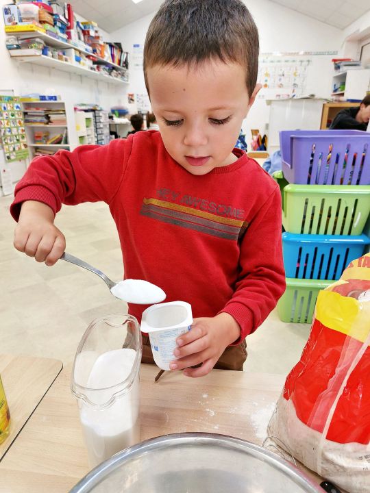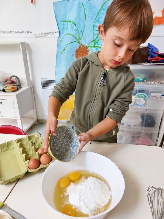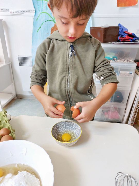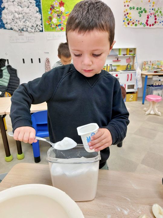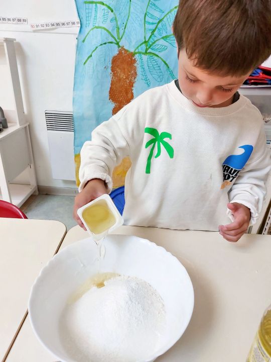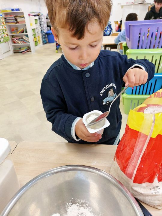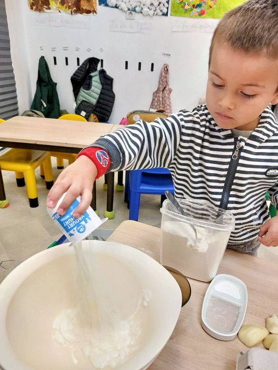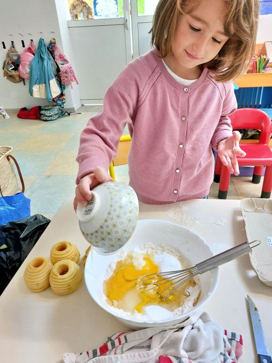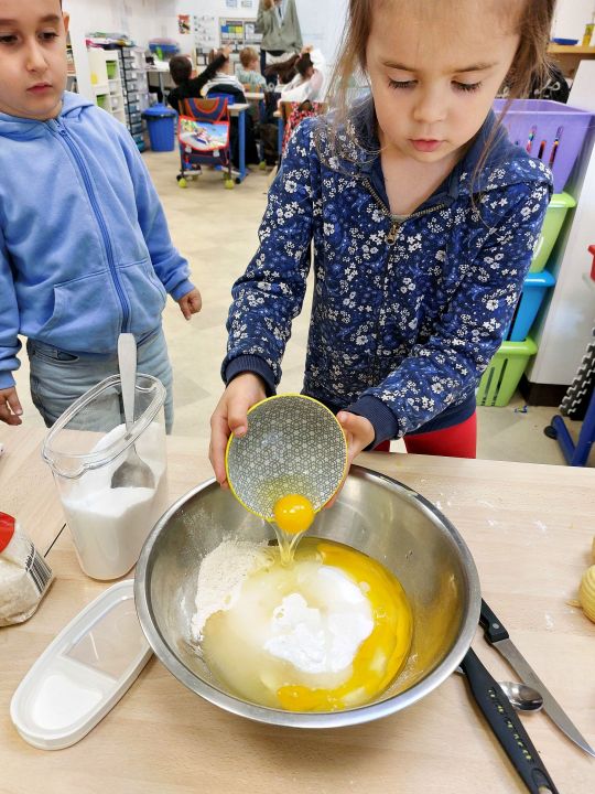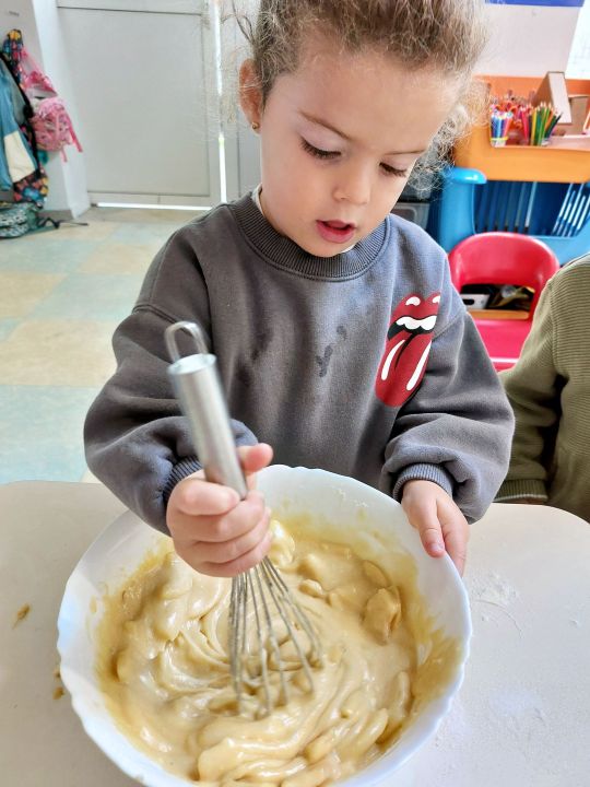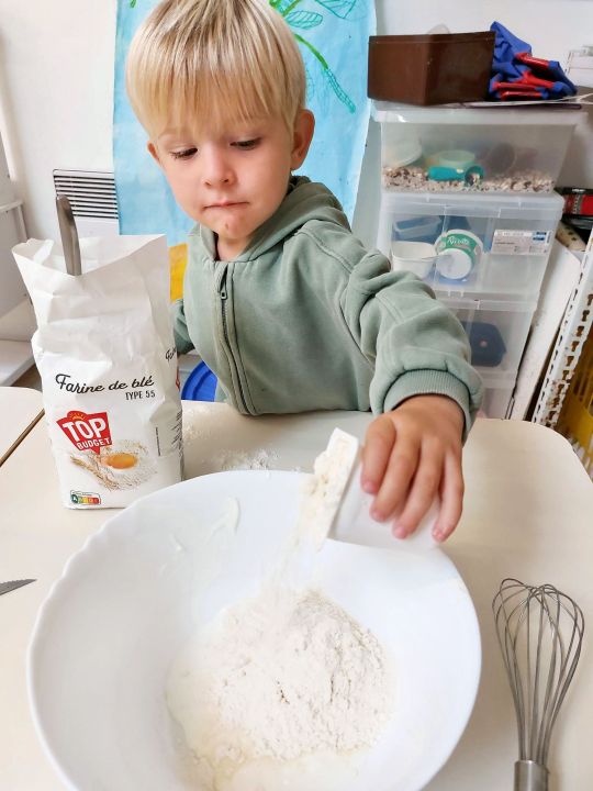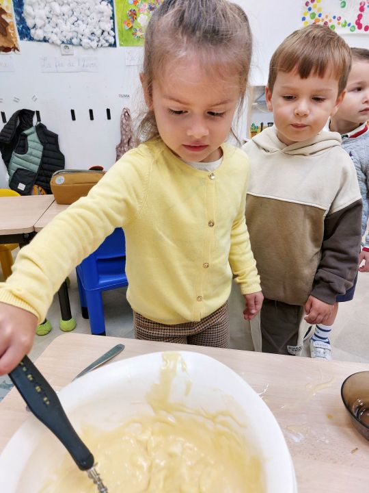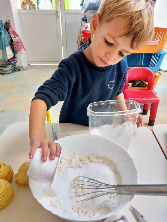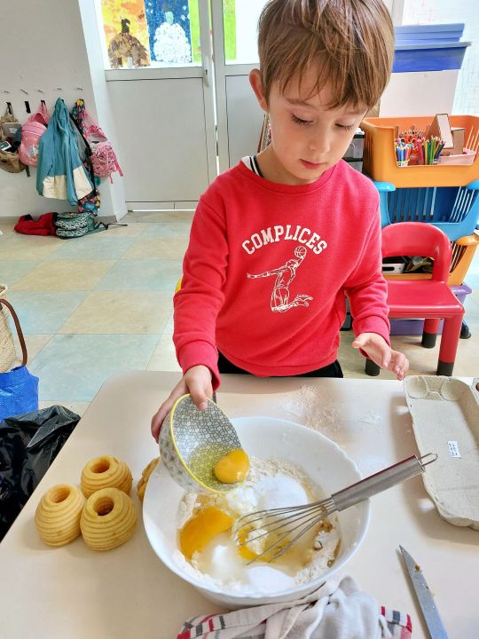 En cette dernière semaine de la première période, nous fêtons l'anniversaire de Maxime. Il fait 5 ans en ce mois d'octobre! Pour cela, nous avons cuisiné un gâteau aux poires avec Marion et nous l'avons partagé l'après-midi....